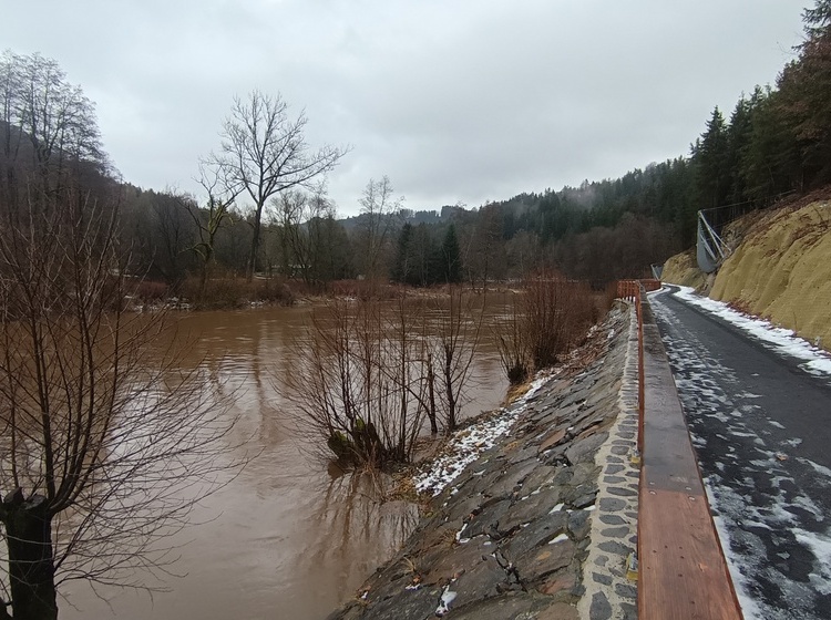 Cyklostezka je i během zvýšeného průtoku v Jizeře schůdná. Žádné z míst na cyklostezce v úseku Železný Brod - Líšný nebylo během aktuálního zvýšeného stavu zaplaveno.