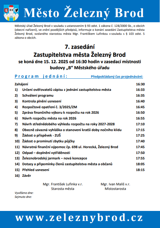 Pozvánka na 7. zasedání Zastupitelstva města Železný Brod 08.12.2025 S datem konání v pondělí 15. 12. 2025 od 16:30 hodin. POZVÁNKA MATERIÁLY PŘÍSTUPNÉ VEŘEJNOSTI Zpět Úvod > Občan > Aktuálně > Pozvánka na 7. zasedání Zastupitelstva města Železný Brod