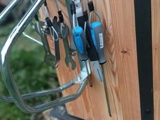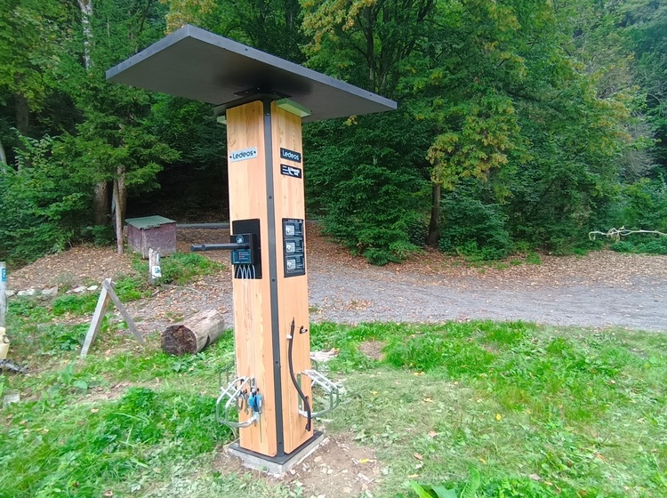 Stojan v areálu Paraplíčko obsahuje kompresor, 4 stojany na kola, nabíjecí box s různými druhy nabíječek, zásuvky 2×USB, 1×autozásuvka, 1×zásuvka 230 V/300W, poličku na telefon, uzamykatelné boxy na kód, pumpu, kompresor, nářadí a opravu.